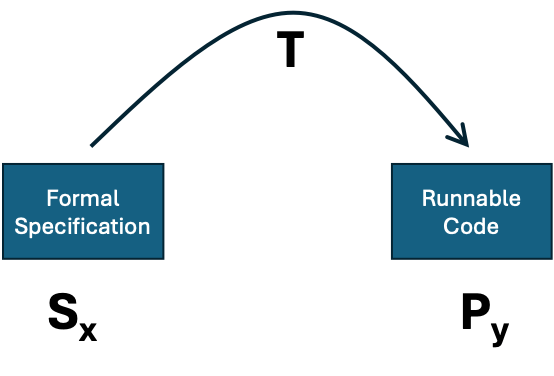 The dream is that one could write a description of what one would like and an algorithm, T, would produce code that fitted that description. However, to enable proofs to be used we need to formalize the situation so that the description, is in some suitably expressive but formal language (e.g. a logic with enumerable expressions). This situation is illustrated in figure 1.