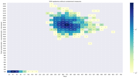 Figure 5 – 1000 Epidemics without containment measures (2D histogram of (Symptomatic+Asymptomatic+Deceased against days)