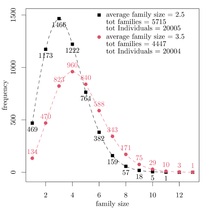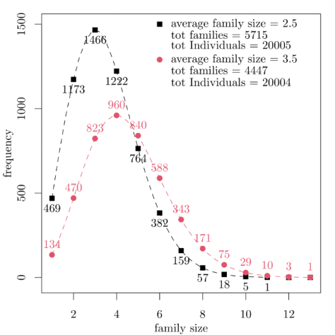 Figure 2: two family size distributions used to initialize the simulation. Figures by the dots inform on the frequency of the corresponding size. Black square relates to the distribution with an average of 2.5; red circles relate to the distribution with an average of 3.5