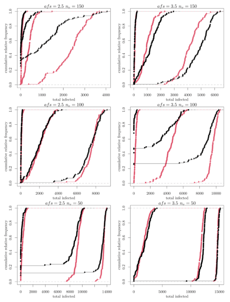 Figure 3 reports the empirical cumulative distribution function (ecdf) of several parametrizations. To easily read the figure, we put the different charts as in a plane having the average family size (afs) in the abscissa and the number of available vaccines (nv) in the ordinate. From above, we know two values of afs (i.e. 2.5 and 3.5) and three values of nv (i.e. 50, 100 and 150) are considered. Therefore figure 3 is made up of 6 charts.